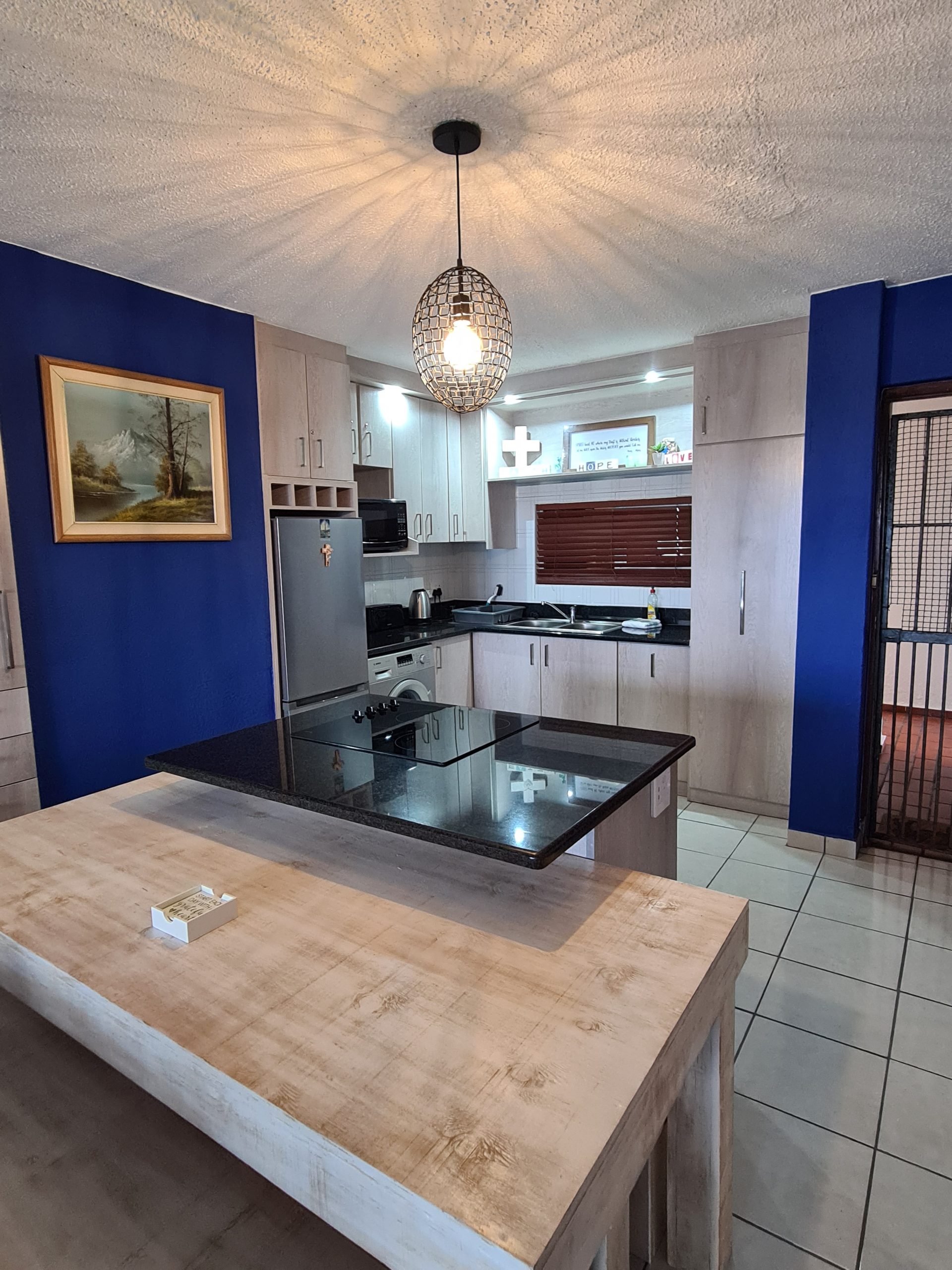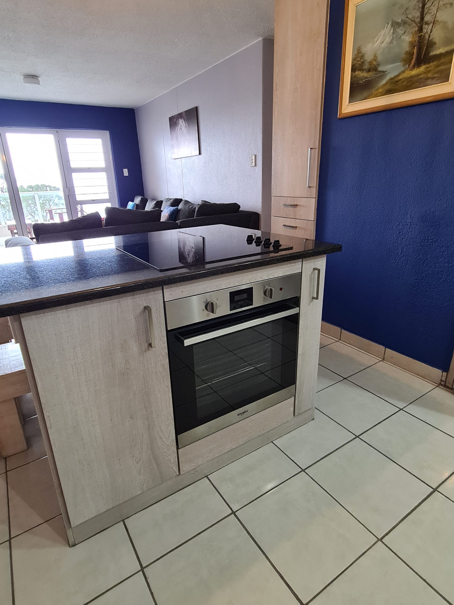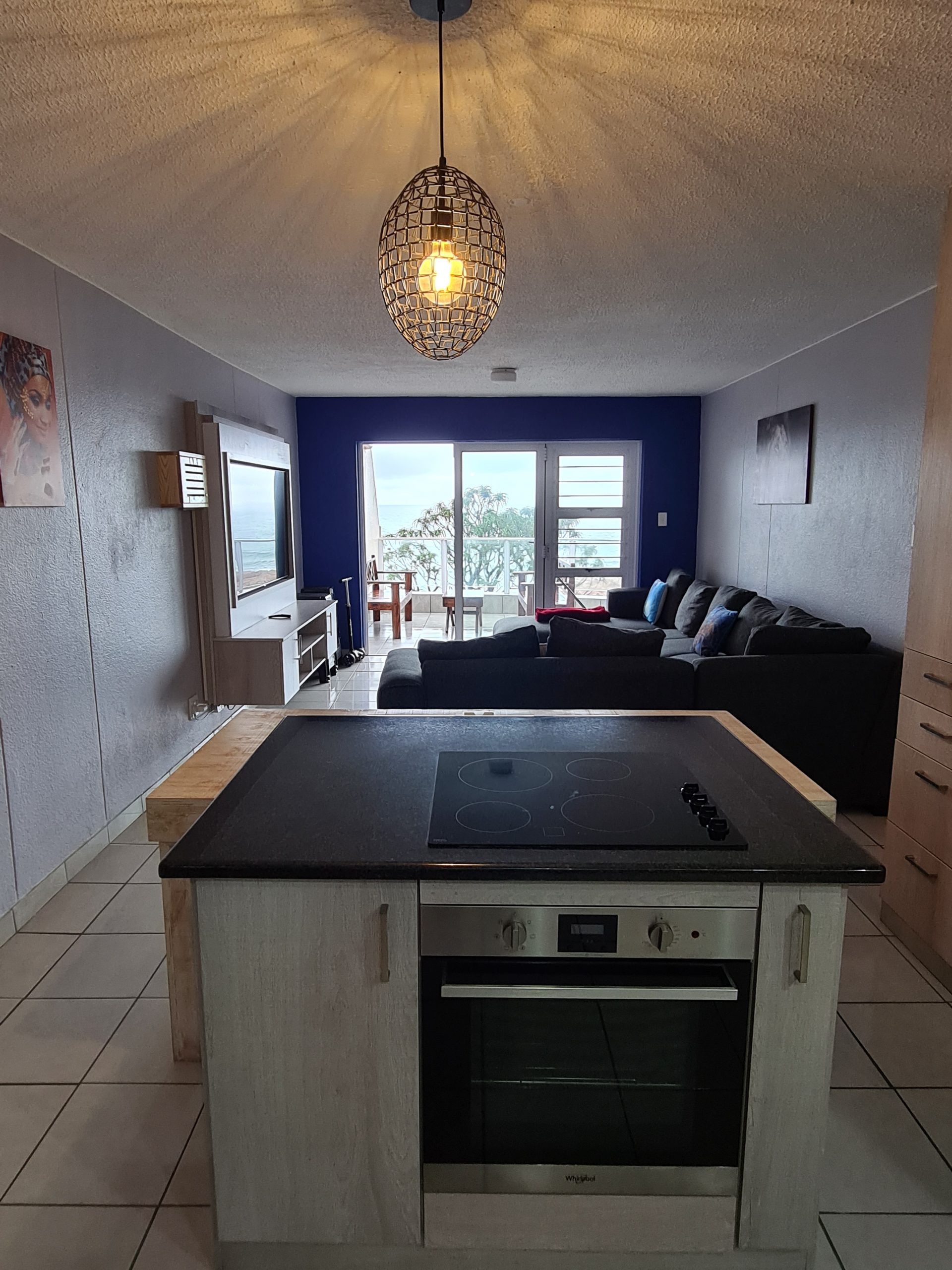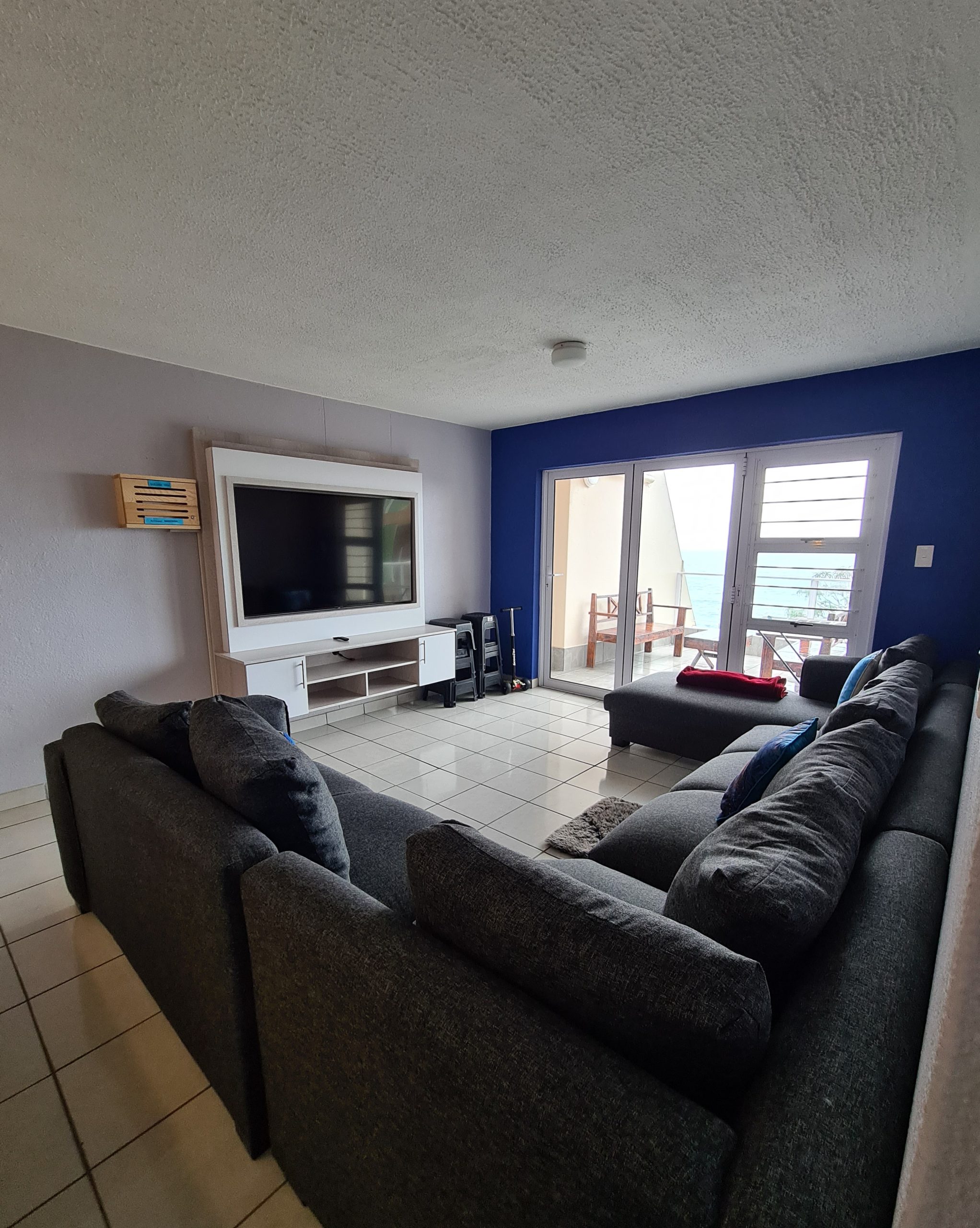 The adjacent open-plan living area has a Smart TV with uncapped WIFI. The living area also opens onto the balcony. The complex also boasts a communal swimming pool, a braai area, a tennis court, and undercover parking for cars.