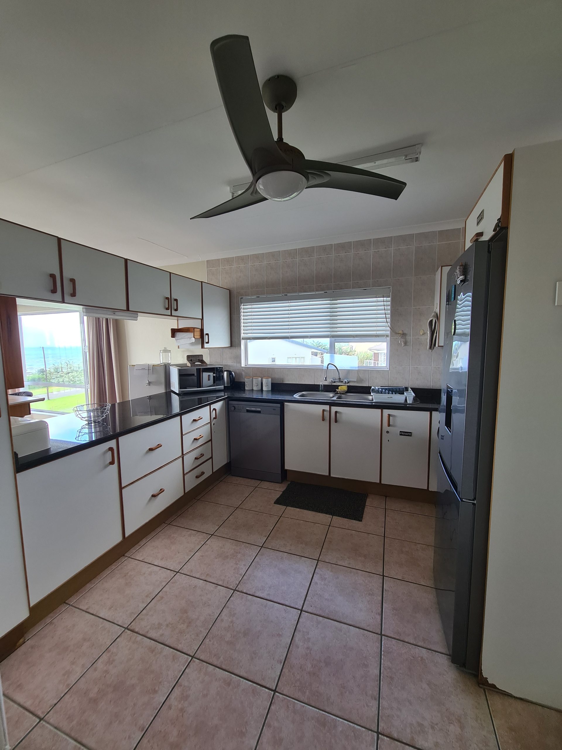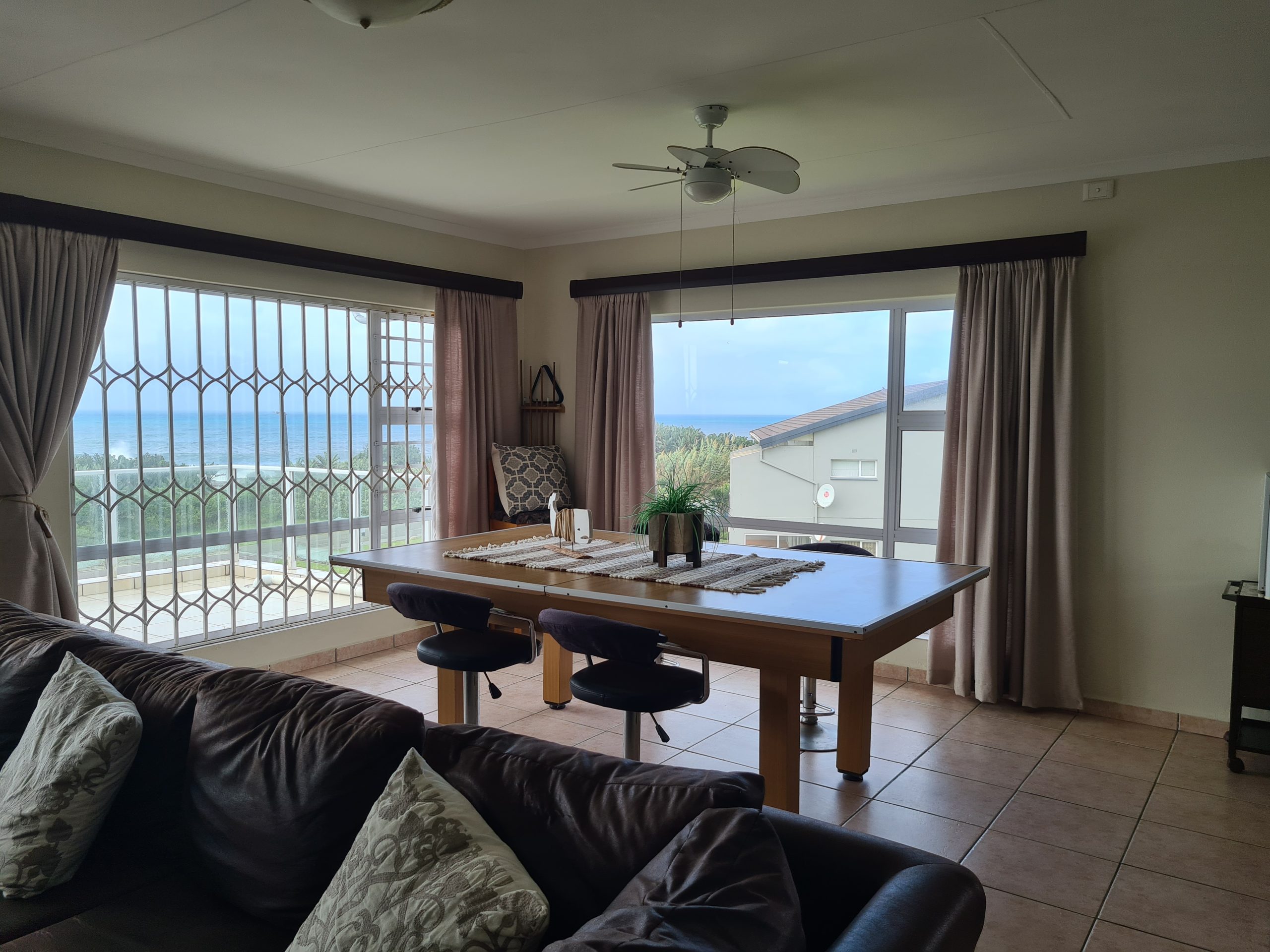 The living area leads to the enclosed indoor braai area, and the front patio overlooking the ocean.